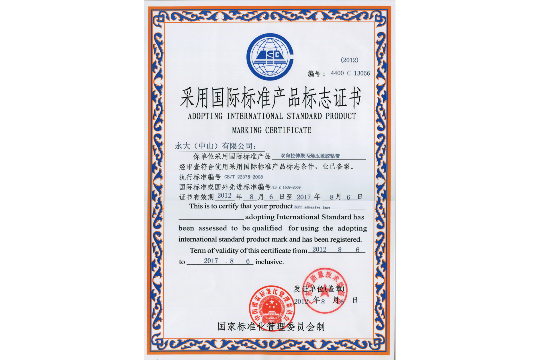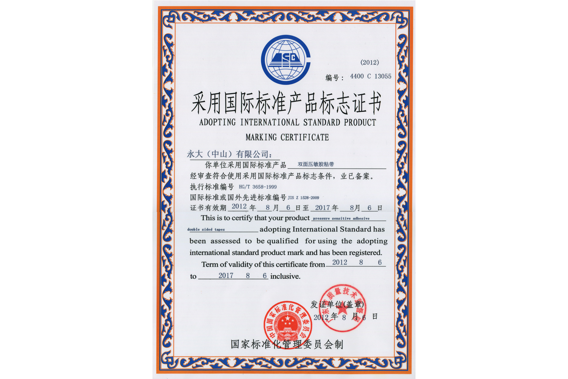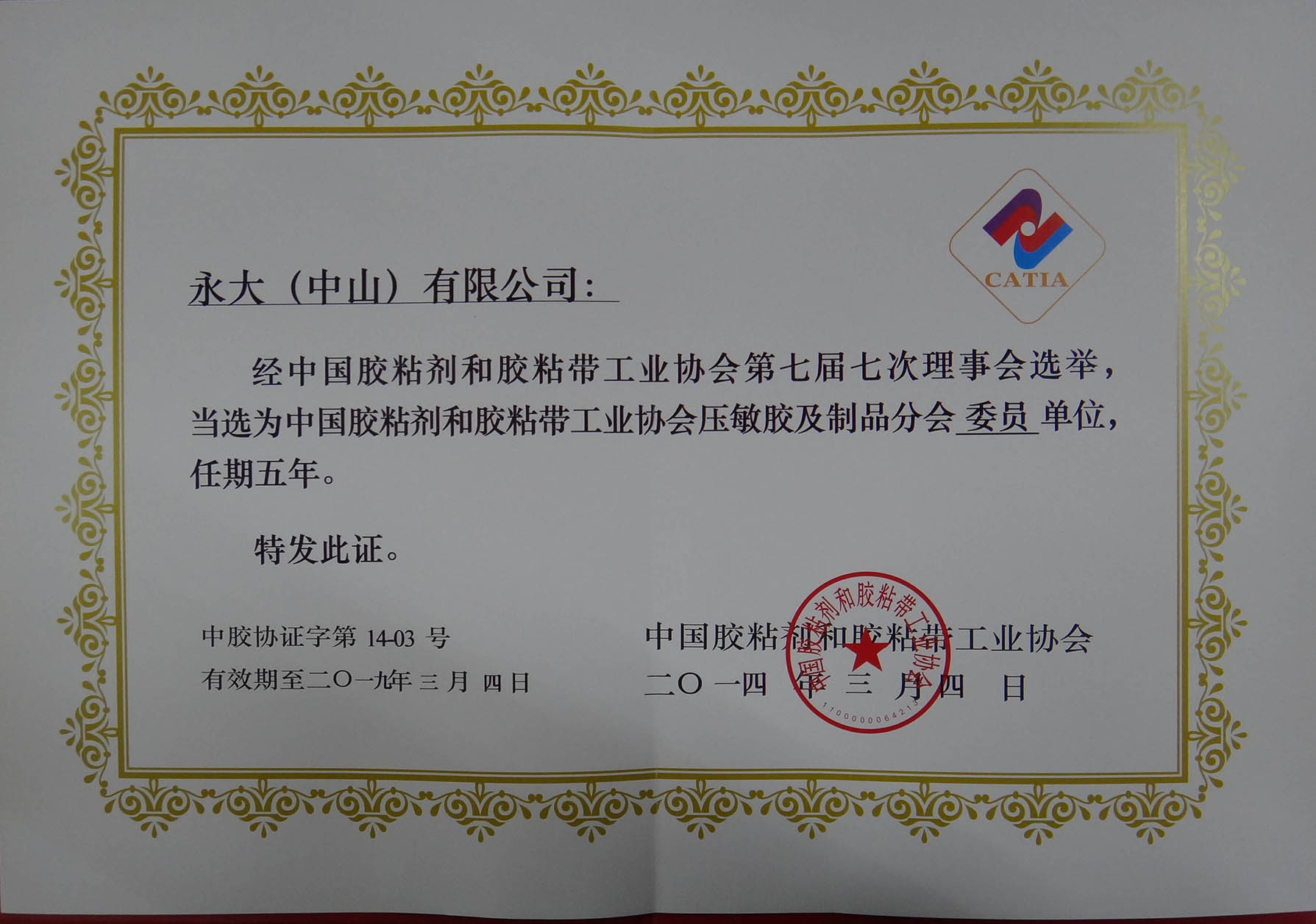 永大公司是中国胶粘剂和胶粘带工业协会副理事长单位、全国胶粘剂标准化技术委员会委员单位、全国胶粘剂标准化技术委员会压敏胶制品分技术委员单位、广东省胶粘剂行业协会副会长单位、广东省专精特新中小企业、广东省创新型中小企业。